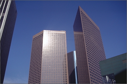 高い建物を近くから撮影すると、建物のアウトラインがたる型に歪みます。 |