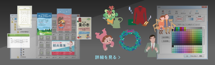 | 多彩な機能と豊富な収録素材で、Officeソフトよりも簡単に見栄えの良いグラフィックを作れます。 |